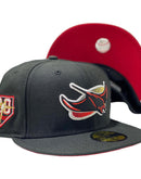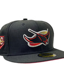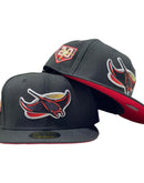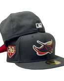 Custom new era fitted hat. all black cap. front logo in black, red and gold. 20th season side patch. matching MLB logo man in the back. red under visor. black sweat band.