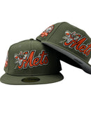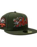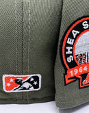 This 59Fifty high crown cap features a unique and stylish design, with an olive green color cap. The front Minor league logo in orange, metallic silver and olive green with black and white outline. Shea stadium side patch on the left mid-panel adds a special touch to the hat, while the tonal New Era flag on the right mid-panel completes the design.