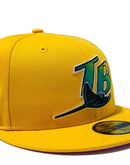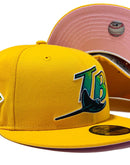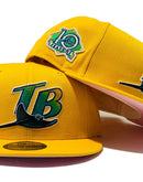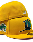 Custom new era fitted. all yellow cap. 10th season side patch. pink under visor. white sweat band. matching MLB logo in the back.