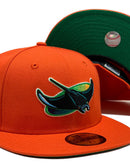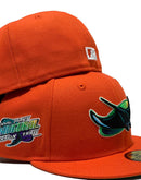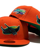 Custom new era fitted hat. all orange wool cap. team original old school string ray logo in front. 1998 inaugural season side patch. green under visor. Matching MLB batter man in the back. black sweat band.