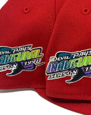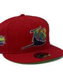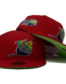 Custom new era fitted hat. all red cap. team old school rays logo in front. 1998 inaugural season side patch. raised mlb batter man in the back. neon green under visor. white sweat band. it features 100 percent wool.