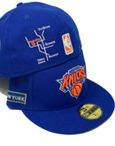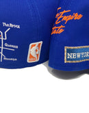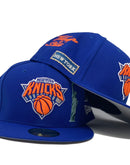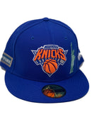Representing Royal Blue New York Knicks NBA City Transit Collection By New Era. 59Fifty high crown cap and Gray under visor. It features an all royal blue color cap. Raised New York Knicks embroidery detailing on front. New York city Icons and transit embroidery detailing all around the hat.