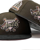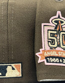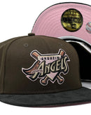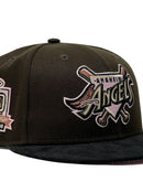 Presenting an exclusive custom New Era fitted hat only from Sports World. 59Fifty high crown cap. it features an all-brown color cap with black cord visor. front Angel's logo in pink, black and metallic copper. 50th anniversary Angel's stadium anniversary side patch on left mid panel in pink, black and metallic copper. tonal new era flag on right mid panel. flat MLB batter man in the back. pink under visor. white sweat band. Crown100 percent polyester and visor is 100% cotton. imported from China.