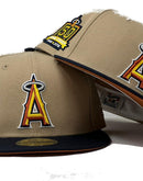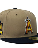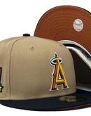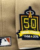Presenting an exclusive custom New Era fitted hat only from Sports World. 59Fifty high crown cap. it features an all-camel color cap with navy blue visor. from "A" logo in yellow and rust orange with navy and white outline. Gray hallo on top of A logo. 50th Angel's stadium anniversary side patch on right mid panel in rust, olive, navy and yellow. tonal new era flag on left mid panel. flat MLB batter man in the back. rust orange under visor. white sweat band. 100 percent polyester. imported from China.