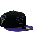 This 59Fifty high crown cap features a unique and stylish design, with an all-black color cap with purple visor. The front logo in purple with black and metallic silver outline, making it stand out from other Diamondbacks hats. The 1998 inaugural season side patch on the left mid-panel adds a special touch to the hat, while the tonal New Era flag on the right mid-panel completes the design.
