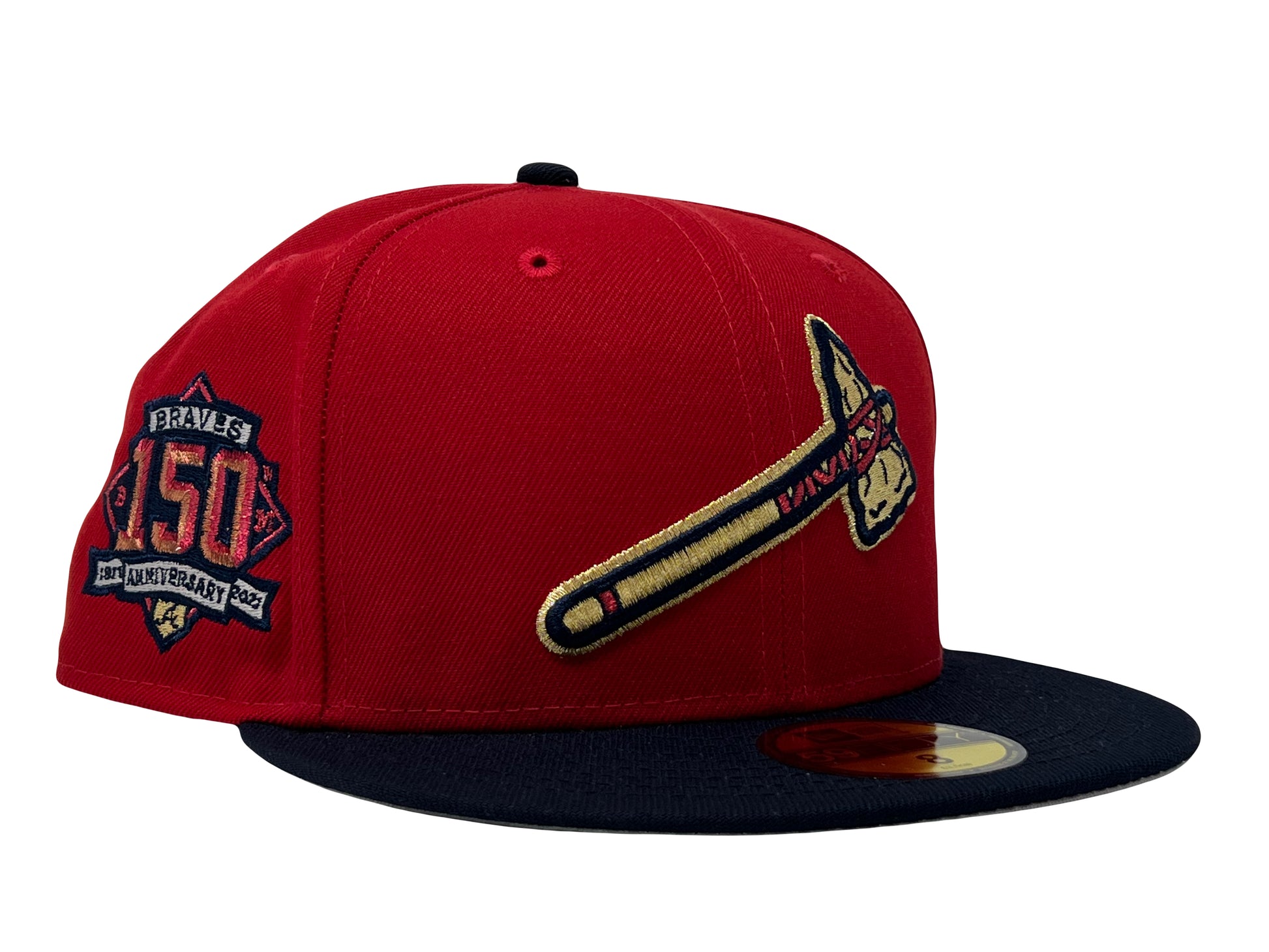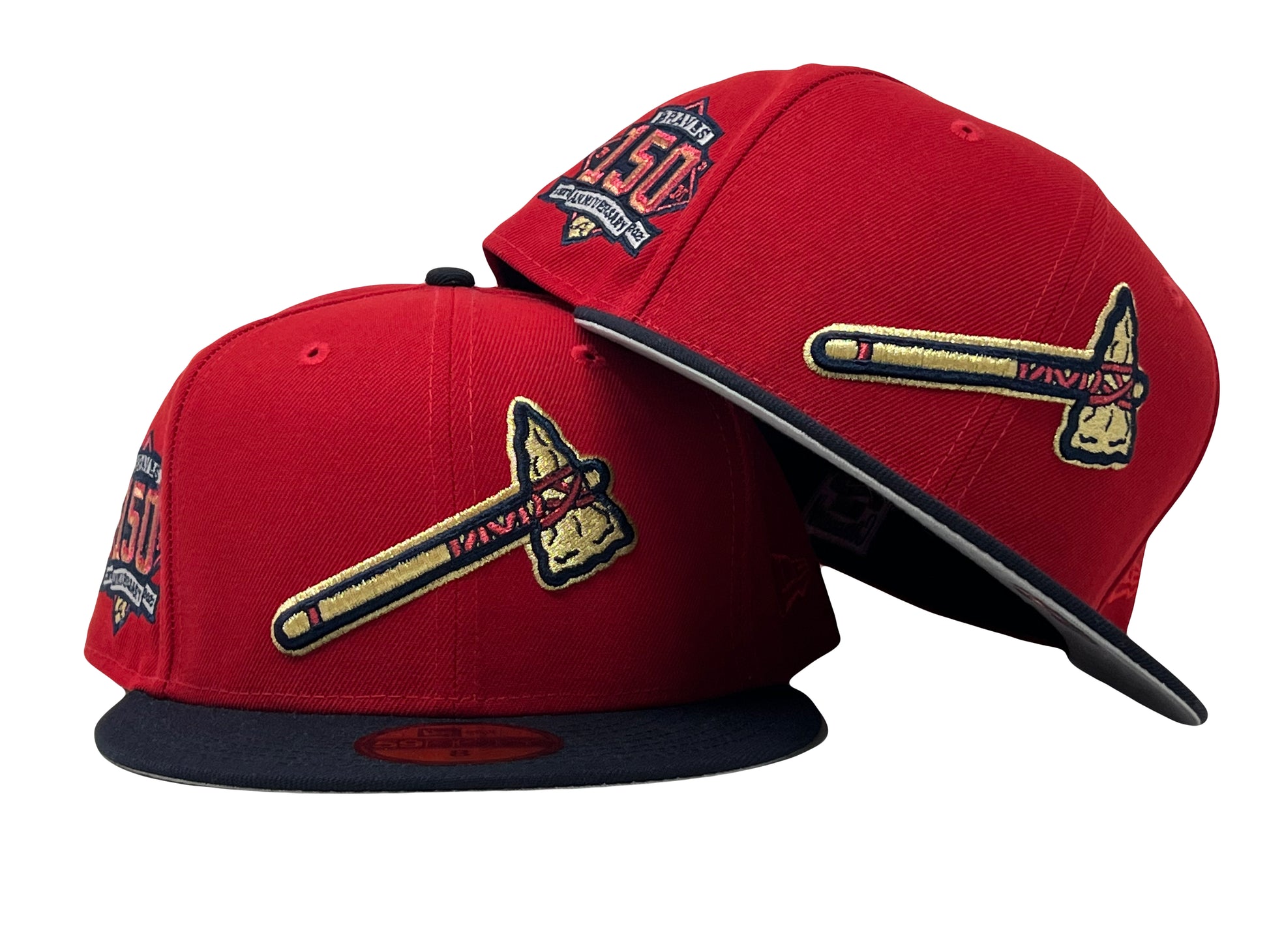 Introducing the Atlanta Braves 150th anniversary New Era Fitted Hat, a must-have accessory for all Braves fans. This high-quality hat is designed to provide a comfortable and stylish fit while representing your favorite MLB team. The intricate embroidery on this hat is unmatched and highlights the team's logo on the front panels, 150th anniversary Side patch, and an MLB batter man in the back.