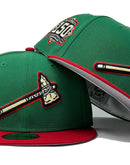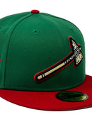 presenting an exclusive " Xmas pack", Atlanta Braves New Era fitted only from Sports World.  59Fifty high crown cap. it features all Kelly-green color crown with red visor. front logo in black and soft yellow with red outline. 150th anniversary side patch in red and black with soft yellow outline. tonal new era flag on right mid panel. flat MLB batter man in the back. Gray under visor. white sweat band. 100 percent polyester. imported from China.