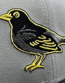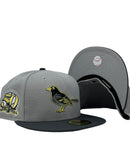 The hat is made of high-quality polyester and features a sleek all-light gray color crown with a storm gray visor. The front of the hat features the Orioles bird logo in storm gray, black and light yellow, and the left mid panel has a 50th anniversary side patch in black, light yellow and white. The back of the hat has a flat MLB Batterman logo.