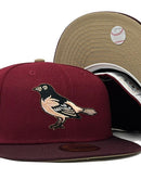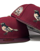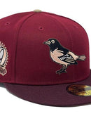 Presenting an exclusive Baltimore Orioles custom New Era cap only from Sports World. 59Fifty high crown cap. it features an all-burgundy color crown with maroon visor. front bird logo in peach and black with metallic copper outline. 50th anniversary side patch on left mid panel. tonal new era flag on right mid panel. flat MLB batter man in the back. Camel under visor. white sweat band. 100 percent polyester. imported from China.