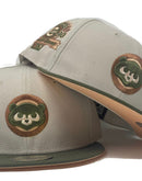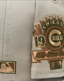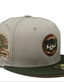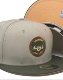 Presenting an exclusive custom New Era fitted hat only from Sports World. 59Fifty high crown cap. it features an all-stone color cap with olive green visor. from logo in olive with copper outline, has little peach outline. 1990 all-star side patch on right mid panel in peach, olive with copper. tonal new era flag on left mid panel. flat MLB batter man in the back. peach under visor. white sweat band. 100 percent polyester. imported from China.