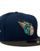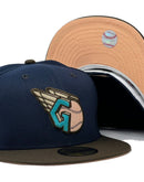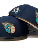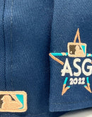 Presenting a custom New Era fitted hat exclusively from Sports World. 59fifty high crown color cap. it features an all-oceanside navy blue color crown with brown visor. front logo in brown and teal with toast outline. Baseball in peach with brown outline. 2022 all-star game side patch on left mid panel in teal and peach with white outline. tonal new era flag on right mid panel. Flat MLB batter man in the back. peach under visor. white sweat band. 100 percent polyester. imported from China.