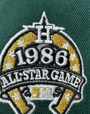 The front logo in metallic gold with green and white outline. 1986 All-star game side patch on the left mid-panel adds a unique touch to the design, commemorating a special moment in the team's history.
