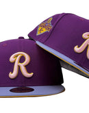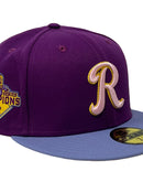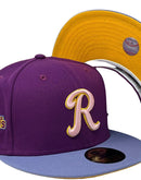 Crafted with precision, this 59Fifty high crown cap features a dark purple base with a soft lavender visor, giving it an elegant yet playful look. The front of the hat is adorned with a "ligature logo" in peach with a yellow outline, adding a pop of color to the overall design. The side patch celebrates the Royals' 2015 World Series Championship win, while the tonal New Era flag on the left mid-panel adds a subtle touch of authenticity. The script Royals logo on the back completes the look.