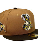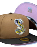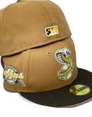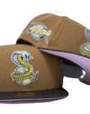 Presenting an exclusive custom Minor league New Era fitted cap to match the Timberland. it features an all-camel color cap with brown visor. front Cobra logo in camel, brown, pink and yellow. Alternate Cobra logo on right mid panel. tonal new era flag on left mid panel. MILB batter man in the back. pink under visor. white sweat band. 100 percent polyester. imported from Bangladesh.