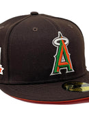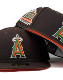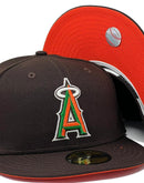 Celebrate your Thanksgiving with a fall colorway, a deep Brown Los Angeles Angels custom New Era fitted hat from Sports World. 59Fifty high crown cap. it features an all-dark brown color cap. Front logo in orange and green with white outline. 50th anniversary side patch on left mid panel. Tonal New Era flag on right panel. Flat MLB batter man in the back. Orange under visor. white sweat band. 100 percent polyester. imported from China.