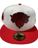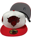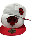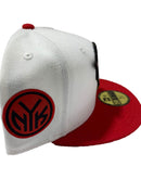 Custom made new era fitted white and red knicks/metal logo with side patch
