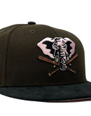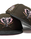 Rep your team with custom new era fitted only from Sports World. 59Fifty high crown cap. it features an all walnut/ brown color crown with black corduroy visor. front logo in pink, black. baseball bat in metallic copper with black outline. 50th anniversary side patch. tonal new era flag on right mid pane. Flat MLB batter man in the back. pink under visor. white sweat band. Crown in 100 percent polyester and visor in 100 percent cotton. imported from China.