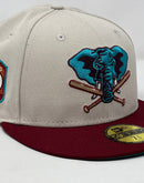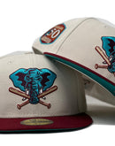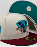 Rep your team with custom new era fitted only from Sports World. 59Fifty high crown cap. all off white color crown with burgundy visor. front logo in teal and burgundy. baseball bat in metallic gold with black outline. 50th anniversary side patch. tonal new era flag on right mid pane. Flat MLB batter man in the back. teal under visor. white sweat band. 100 percent polyester. imported from China.