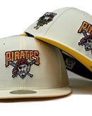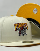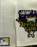 presenting an exclusive custom New Era fitted hat only from Sports World. 59Fifty high crown cap. it features all off white color cap. front logo in red, black and yellow with white outline. 2006 all-star game side patch in red, yellow and purple, green with white outline. tonal new era flag on right mid panel. flat MLB batter man in the back. Taxi yellow under visor. black sweat band. 100 percent polyester. imported from China.