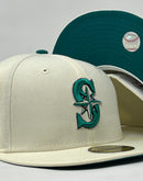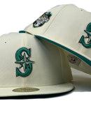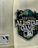 Presenting an exclusive custom "off white dome" collection, Seattle Mariners New Era fitted hat from Sports World. 59fifty high crown cap. it features an all-off white color cap. front logo in team colorway, aqua with metallic silver outline. 2023 all-star game side patch on left mid panel. tonal new era flag on right mid panel. Raised MLB batter man in the back. aqua under visor. white sweat band. 100 percent polyester. imported from China.