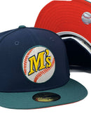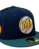 Presenting an exclusive custom New Era fitted " Space Pack 2" only from Sports World. 59Fifty high crown cap. It features all navy-blue color crown with aqua green visor. Front logo, "M's" in yellow, baseball stitch in orange. background in white and aqua outline. 35th anniversary side patch on left mid panel in white, aqua orange and yellow. flat MLB batter man in the back. orange under visor. white sweat band. 100 percent polyester. imported from China.