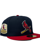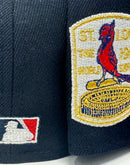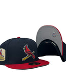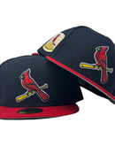 Introducing a unique custom St. Louis Cardinals 1967 World Series gray brim new era fitted hat from Sports World. The 59Fifty high crown fitted hat is designed with a sleek all dark navy blue color crown and a stylish red visor that provides a bold contrast to the classic design.