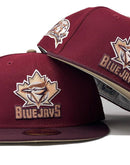 Presenting an exclusive Toronto Blue Jays " Shade of burgundy collection", 25th Anniversary New Era fitted hat from Sports World. 59Fifty high crown cap. It features all burgundy color cap with maroon visor. Front logo in peach and metallic copper with maroon outline. 25th anniversary side patch on left mid panel in maroon, camel and ivory. Tonal new era flag in left mid panel. Flat MLB batter man in the back. camel visor. White sweat band. 100 percent polyester. Imported from China.