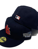 Representing your team with Dark Navy St. Louis Cardinals 2004 World Series New Era fitted hat. 59fIfty high crown cap and gray under visor. Front logo in white 2004 world series side patch. Raised MLB batter man in the back. White sweat band. 100 percent wool.