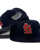Representing your team with Dark Navy St. Louis Cardinals 2004 World Series New Era fitted hat. 59fIfty high crown cap and gray under visor. Front logo in white 2004 world...