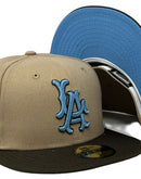 Presenting a custom New Era fitted hat exclusively from Sports World. 59fifty high crown cap. it features a camel color crown with brown visor. front logo in sky blue with brown outline. 50th anniversary side patch on left mid panel in sky blue, brown and metallic copper with white outline. tonal new era flag on right mid panel. Flat MLB batter man in the back. sky blue under visor. white sweat band. 100 percent polyester. imported from China.