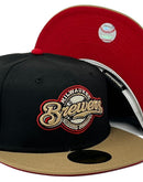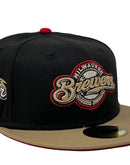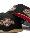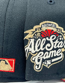 Presenting an exclusive Milwaukee Brewers all-star game New Era fitted hat only from Sports World. 59Fifty high crown cap. it features all black color cap with camel visor. front logo in camel, Chevrolet gold with red outline. 2002 all-star game side patch on left mid panel. tonal new era flag on right mid panel. Flat MLB batter man in the back. red under visor. White sweat band. 100 percent polyester. imported from Bangladesh.