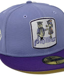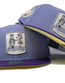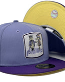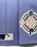 Philadelphia Phillies 100th Anniversary "Lavender Lemonade" collection from Sports World. 59Fifty high crown cap. Old school phillies logo in front in white with and soft yellow with purple outline. 100th anniversary side patch in right mid panel. Soft yellow under visor. White sweat band. 100 percent polyester. Imported from Bangladesh.