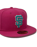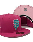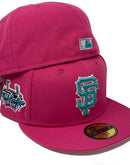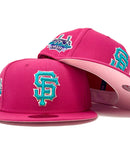 Rep your team with custom new era fitted exclusively at sports world. 59fifty high crown cap. all pink color high structured fitted. front logo in teal with pink outline. tell it good buy giants candlestick park side patch. Flat MLB batter man in the back. pink under visor. white sweat band. 100 percent polyester. imported from Bangladesh.