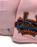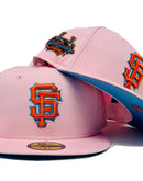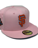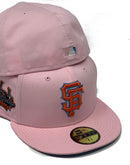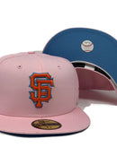 Custom new era fitted hat. all light pink new era fitted hat. front logo in orange with sky blue outline. Candlestick park side patch. Flat MLB batter man in the back. sky blue under visor. white sweat band. 100 percent cotton.