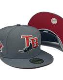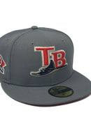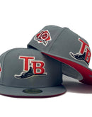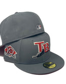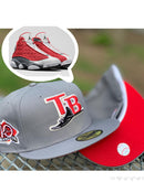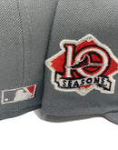 Custom new era fitted hat to match flint 13. all storm gray cap. front logo in red, black with metallic silver. 10th season side patch. flat MLB batter man in the back. red under visor. white sweatband