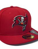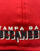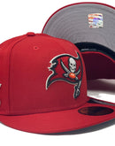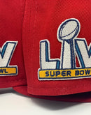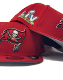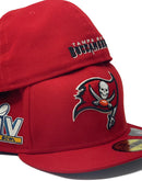 On field new era fitted hat. all red cap team original logo in front. 55th super bowl side patch. spell out buccaneers logo in the back. gray under visor. black sweat band.