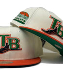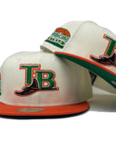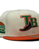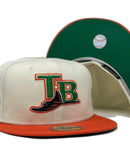 Presenting a custom New Era fitted hat exclusively from Sports World. 59Fifty high crown cap. It features an all off white color crown with orange color visor. front tb logo in green with orange outline. rays in green with orange outline. tropicana field side patch on left mid panel. tonal new era flag on right mid panel. flat MLB batter man in the back. green under visor. white sweat band. 100 percent polyester. imported from China.