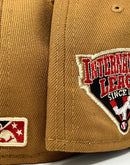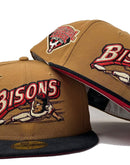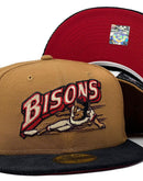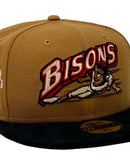 Presenting an exclusive custom New Era fitted hat from Sports world. 59Fifty high crown cap. it features an all-bronze color cap with black cord visor. front Bisons logo in black, red, metallic gold and copper. International League side patch on left mid panel. tonal new era flag on right mid panel. Raised MILB batter man in the back. Red under visor. white sweat band. 100 percent polyester. imported from Bangladesh.