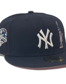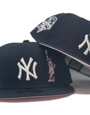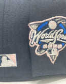 Navy Blue New York Yankees 2000 World Series custom New Era fitted hat from Sports World. 59Fifty high crown cap. FrontΒ yankees logo in white. Statue of liberty logo in light pink with navy outline. 2000 world series sider patch in light pink, royalΒ and white. Tonal new era flag on left mid panel. Pink under visor. White sweat band. 100 percent polyester. Imported from Bangladesh.