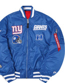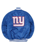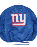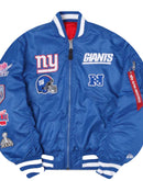 The Alpha Industries X New York Giants MA-1 Bomber Jacket features embroidered Giants patches throughout the chest and sleeves with an embroidered applique team wordmark at the rear. Additional details include a utility pocket with the Alpha Industries ribbon at the left sleeve. The reversible jacket features a black interior with a screen-printed team logo at the left chest and a multi-lingual message at the rear.