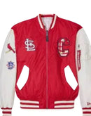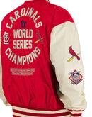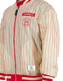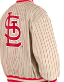 On one side of the jacket we have chrome white sleeves with team color body featuring a custom left chest printed applique as well as a mix of embroidery and applique on the sleeves and back. On the reverse side of the jacket, we have chrome white body with team color pinstripes and a mix of screenprint graphics and embroidered applique.