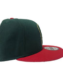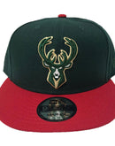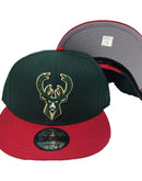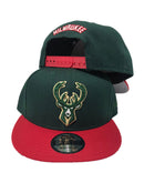 new era snapback. Green cap with red visor. front logo is team original logo. red bartack. milwaukee speel out logo on back. gray undervisor. black sweatband.