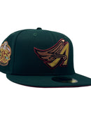 Introducing a unique custom Los Angeles Angels red brim New Era fitted hat from Sports World. The 59Fifty high crown fitted hat is designed with a sleek all-dark green color cap that provides a bold contrast to the classic design.