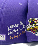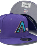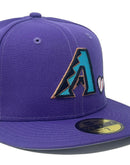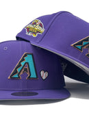 The Arizona Diamondbacks Team Heart 59FIFTY Fitted Cap features an embroidered Diamondbacks logo and heart shaped baseball at the front panels with a 2001 World Series patch at the right-wear side. Additional details include the MLB Batterman logo with an embroidered quote at the rear and a gray under visor.