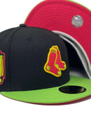 Presenting an exclusive collection New Era fitted hat only from Sports World. 59Fifty high crown cap. It features an all-black color cap with lime green visor. Front logo in lava red and lime green with yellow outline. 1999 all-star game side patch on right mid panel. tonal New Era flag on left mid panel. flat MLB batter man in the back. Lava red under visor. white sweat band, 100 percent polyester. imported from China.