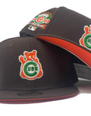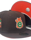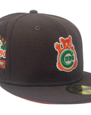 Celebrate your Halloween with a fall colorway, Deep Brown Chicago Cubs custom New Era fitted hat from Sports World. Front Cubs logo in brown, white, green and orange. 1990 all star game side patch in left mid panel. Tonal New Era flag on right panel. Flat MLB batter man in the back. Orange under visor. white sweat band. 100 percent polyester. imported from Bangladesh.