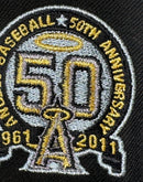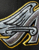 Introducing a unique custom throwback Angels 50th anniversary gray brim New Era fitted hat from Sports World. The 59Fifty high crown fitted hat is designed with a sleek all black color cap that provides a bold contrast to the classic design.