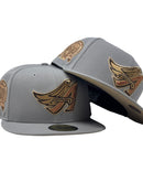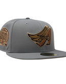 Introducing a unique custom throwback Angels 50th anniversary toast brim New Era fitted hat from Sports World. The 59Fifty high crown fitted hat is designed with a sleek all light gray color cap...