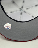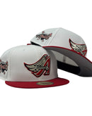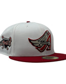 Introducing a unique custom throwback Angels gray brim New Era fitted hat from Sports World. The 59Fifty high crown fitted hat is designed with a sleek all white color cap with red visor that provides a bold contrast to the classic design.