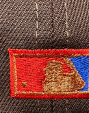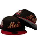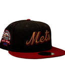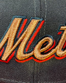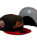 This 59Fifty high crown cap features a unique and stylish design, with a dark brown color cap with red visor. The front logo in metallic copper with black and red outline making it stand out from other Mets hats. Shea stadium side patch on the left mid-panel adds a special touch to the hat, while the tonal New Era flag on the right mid-panel completes the design.